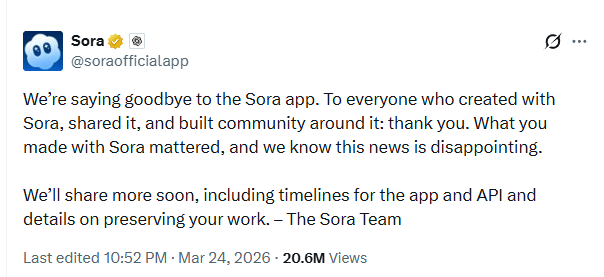 OpenAI завершує підтримку Sora 1 (13.03.2026 офіційно) - першої версії свого інструменту для генерації відео. Якщо ви створювали відео або зображення у Sora,
