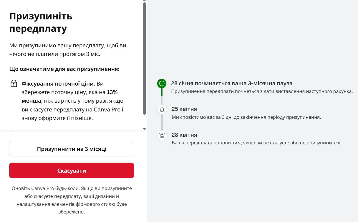 Canva дозволяє призупинити підписку на 3 місяці,
