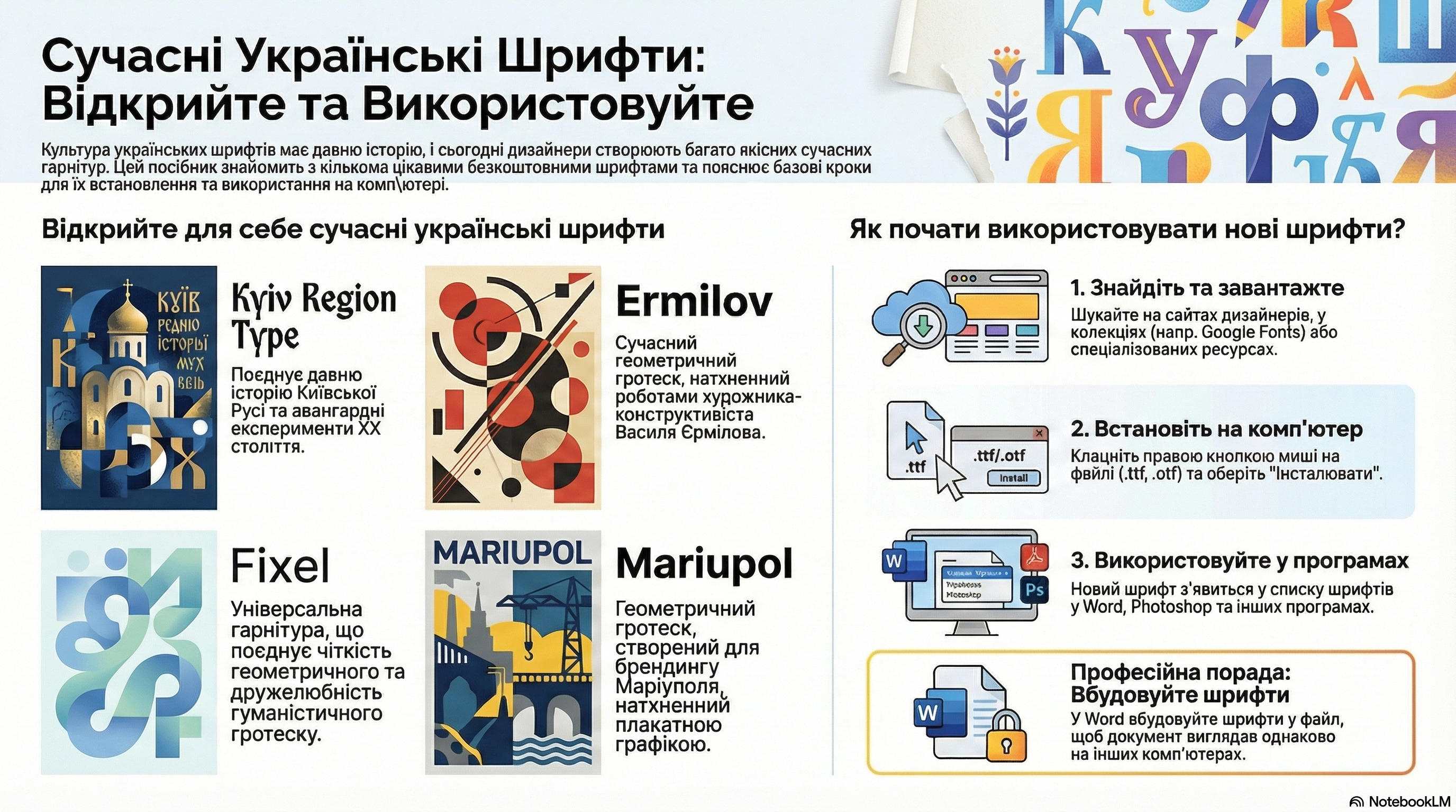 Правильний вибір шрифтів з підтримкою кирилиці - це основа якісного оформлення документів, презентацій та веб-проєктів українською мовою.